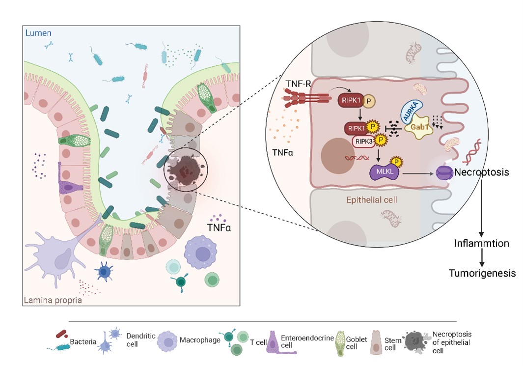 支架蛋白Gab1调控炎症环境肠上皮细胞坏死性凋亡的分子机制模式图